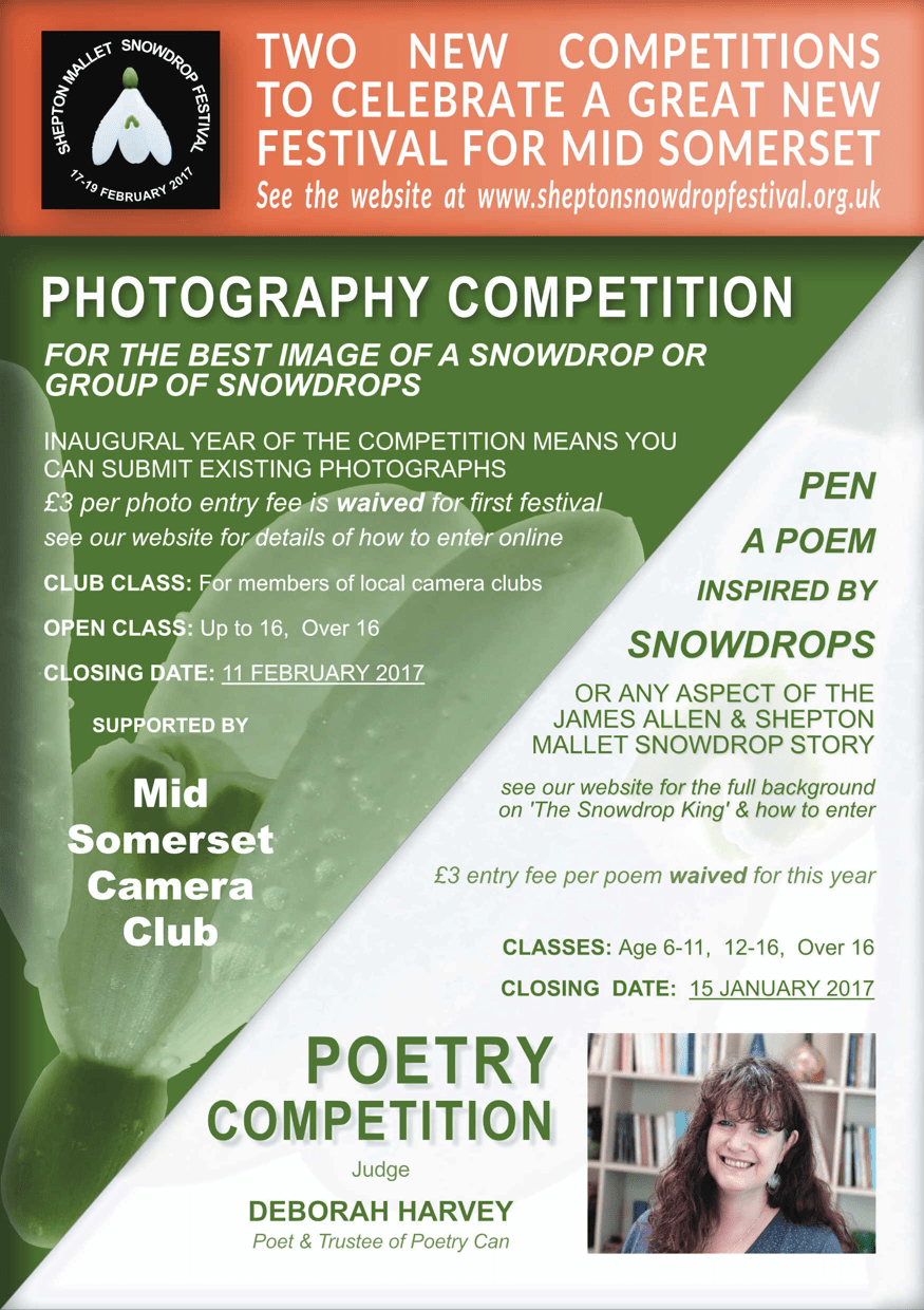 There is much more information about the Competition (and about the related photography competition and workshop) on the Festival’s website (www.sheptonsnowdropfestival.org.uk) – go to ‘Competitions’ at the top of the page. This also leads to the entry form. The Poetry Competition closes at midnight on 15 January 2017 – so do not delay putting in your entries.