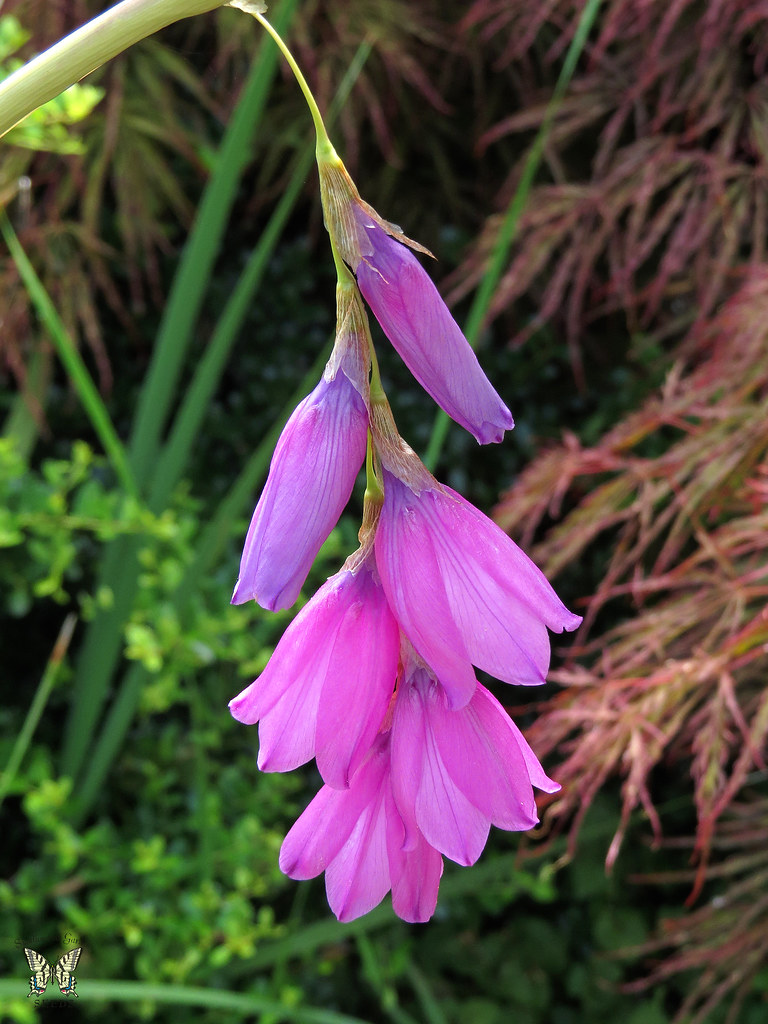 Dierama pulcherrimum is the species most commonly grown. It makes an evergreen grassy clump from which emerge tall wiry stems alight with silvery-pink bells that dance in the slightest breeze. Selections have been made whose flowers are all shades from white (D.pulcherrimum ‘Guinevere’), through pink to darkest wine red (D.pulcherrimum ‘Merlin’ and D.pulcherrimum ‘Blackbird’).