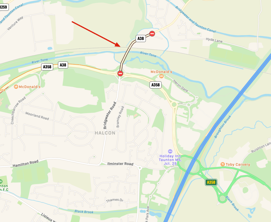 Alternatives are head towards Ilminster A358, take first left through Ruishton and Creech St Michael.