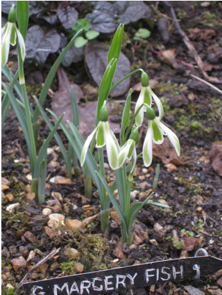 hybrids. Galanthus‘Ophelia’ is still to be found growing in the garden along with many others including Galanthus‘Margery Fish’, a chance cross found in the garden in 1987 and named in her honour.